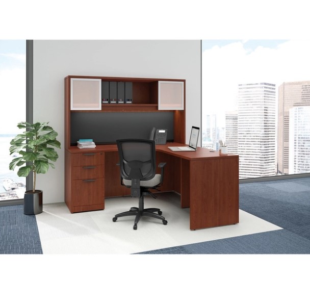Laminate L Shape Desk With File Pedestal And Overhead Hutch With Glass Doors2-Person Cubicle Workstation | Laminate Gallery Panels | Sol Series | 6x6x52″-39″H