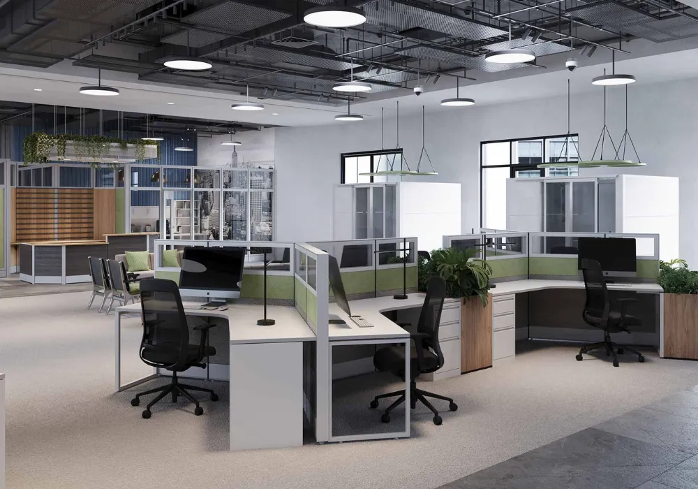 Scalable cubicle systems in DeKalb County integrate collaborative zones with focused work areas.