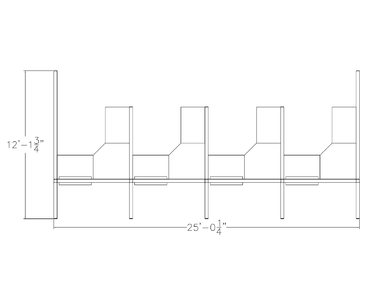 Pictured here is a 25′ wide x 12′ deep row of customer service cubicles. Each individual space measures 6′ x 9′ and include an L-shaped worksurface and transaction window. Use this arrangement  for ticket sales, customer assistance booths, government agencies, or any other situation where separated space is require between people.