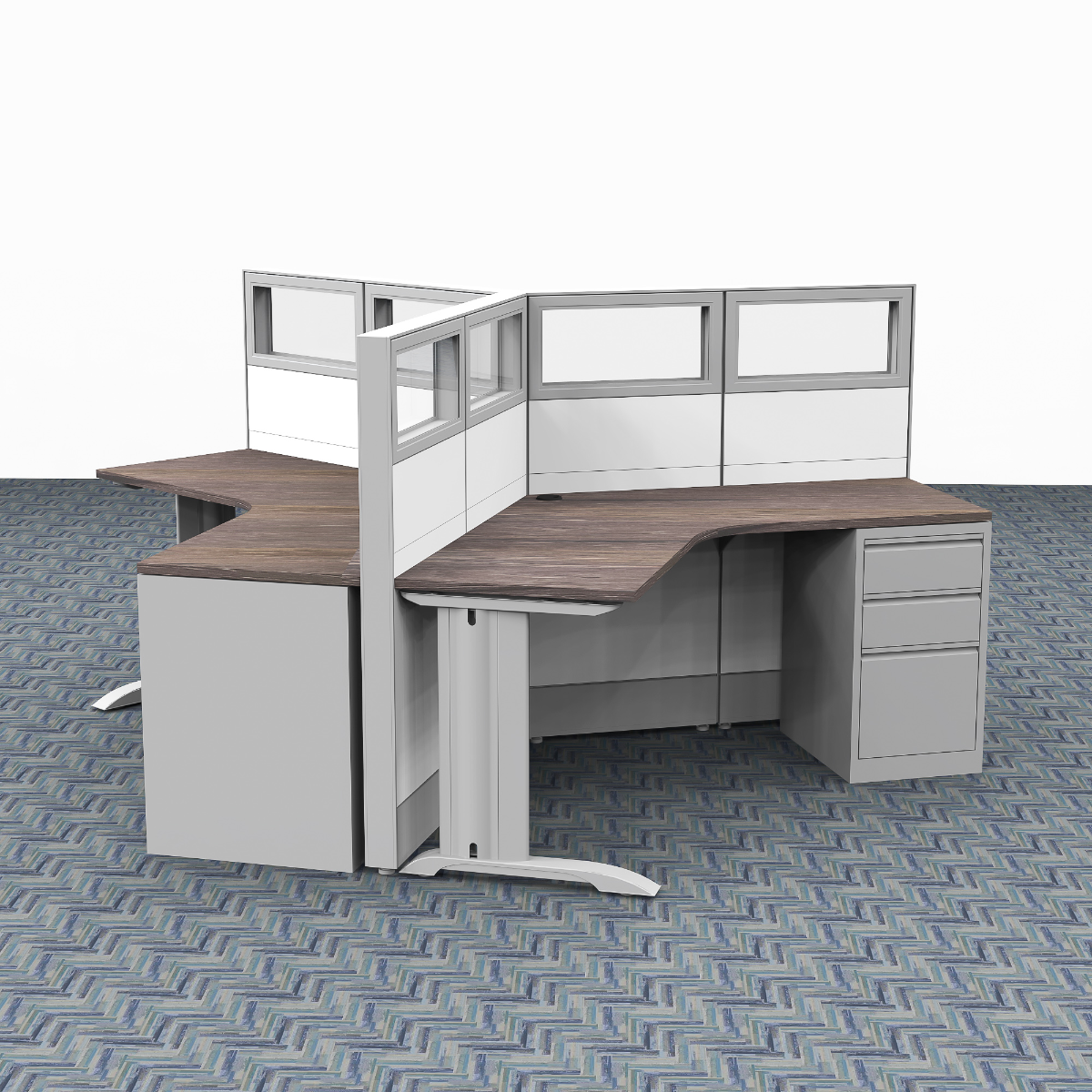 The 3-person cubicle workstation pictured on this page consists of our Sapphire Cubicle System divider panels with 120 degree-shaped worksurfaces. You can select alternate colors for the panels, the overall dimensions of the workspace sizes, the height of the panel divider walls, and the shape of the worksurfaces if you’d like. Also, there are many accessories you can add to your cubicle workspaces such as locking overhead storage bins, pedestal cabinets, accessory racks, monitor arms, paper trays, writing utensil holders, and many other features to complete your project.