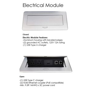Pictured on this page is a 10 foot hexagon conference table. It features an irregular hexagon shaped tabletop, square metal bases, and your choice of laminate. You can add a USB/Electrical module to any table over 4? in overall length. The price on the page includes shipping. Also, you can call with any questions prior to ordering online.