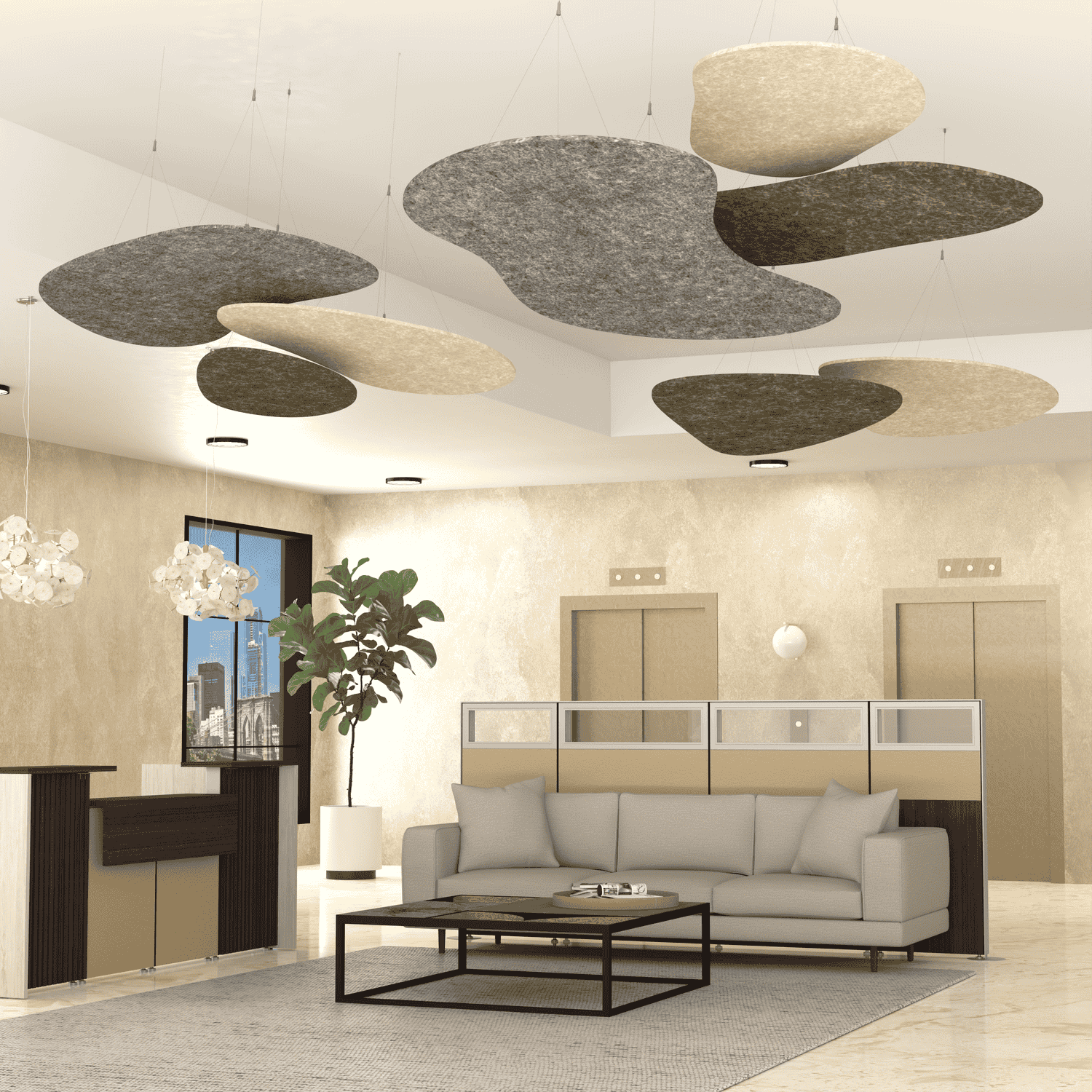 Set of 9 Acoustic Ceiling Panels | Leaf Shaped | Mixed Sizes and Colors2-Person Cubicle Workstation | Laminate Gallery Panels | Sol Series | 6x6x52″-39″H