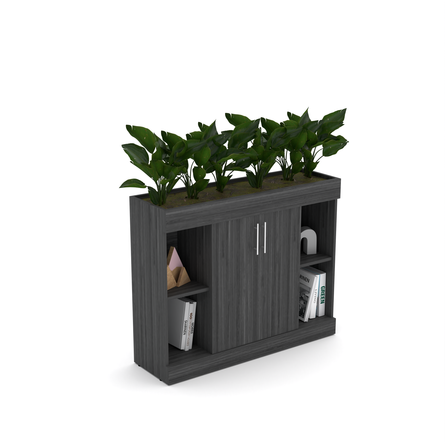 This floor planter features a 2-door cabinet in the middle, with 2 shelves on each side, and planter space on top. It is designed to create a refreshing, natural atmosphere that promotes wellbeing and productivity,  therefore it is perfect for modern office décor, open floor plans, lobbies, and collaborative workspaces. These indoor floor planters seamlessly integrate greenery into your workspace.