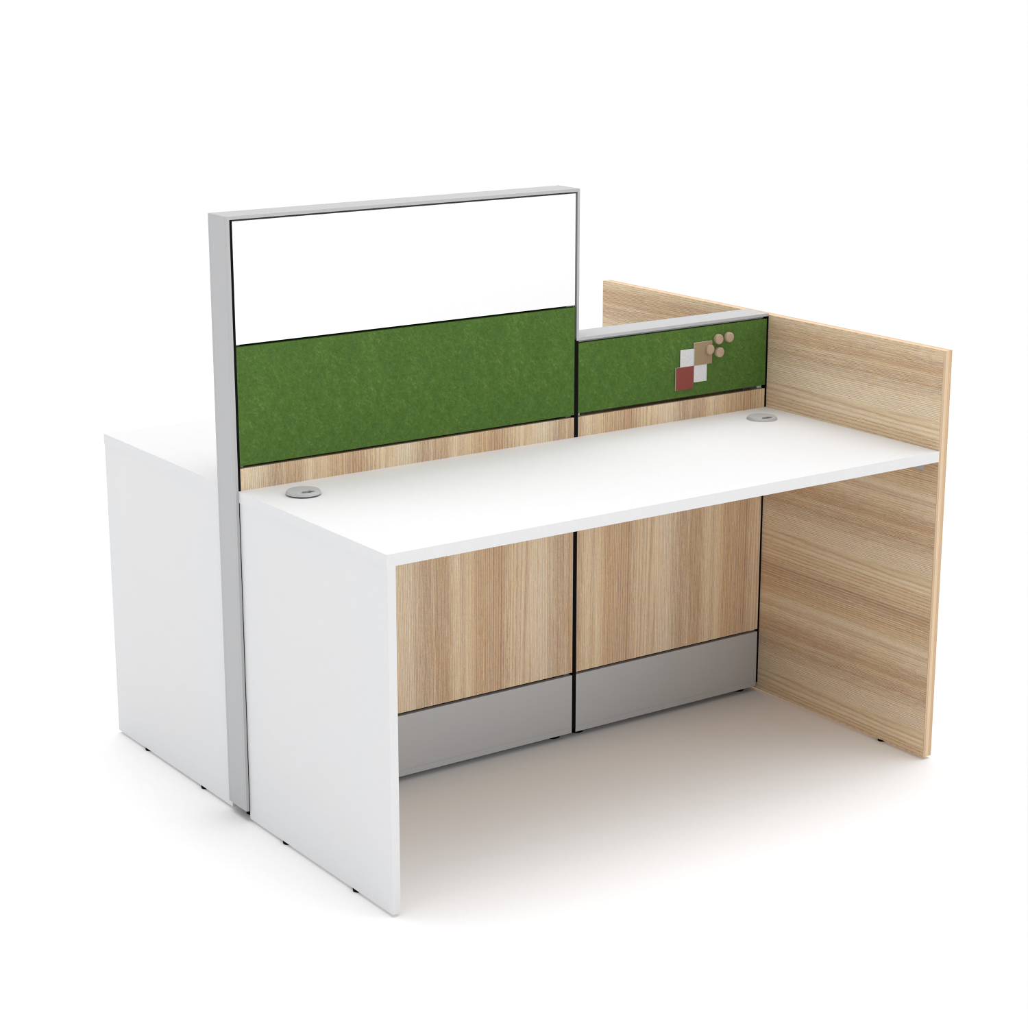 Ideal for customer support, administrative roles, or any setting that benefits from dual-user functionality, this layout optimizes floor space while maintaining a clean, professional appearance. The lower 39″ panels at the center offer an open line of sight and promote natural light flow, while the taller 52″ side panels help reduce ambient distractions and enhance focus.