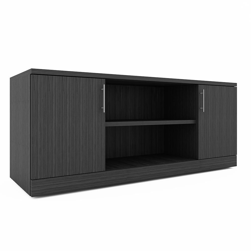 The included 2-door credenza provides discreet storage beneath desk height, keeping clutter hidden behind sleek laminate doors. Use it for supplies, paperwork, or tech accessories that need to be accessible but out of sight.