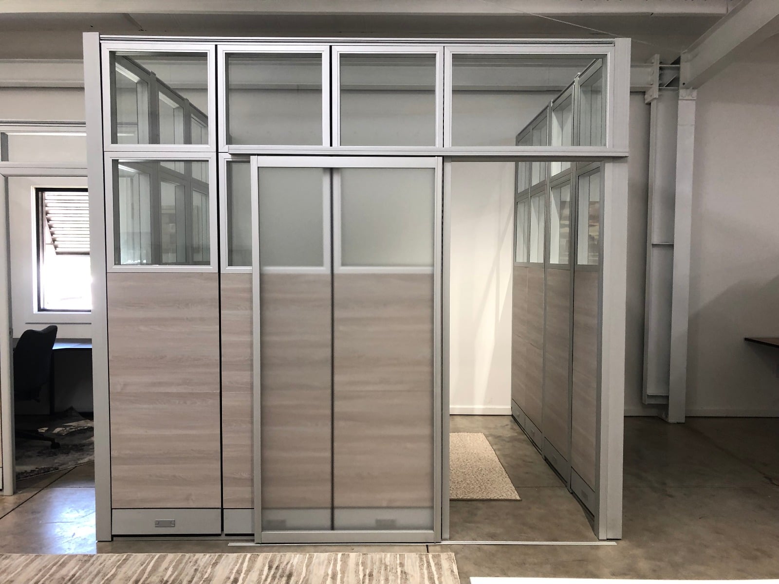 A demountable divider wall system used to create offices, conference rooms, and collaboration areas.