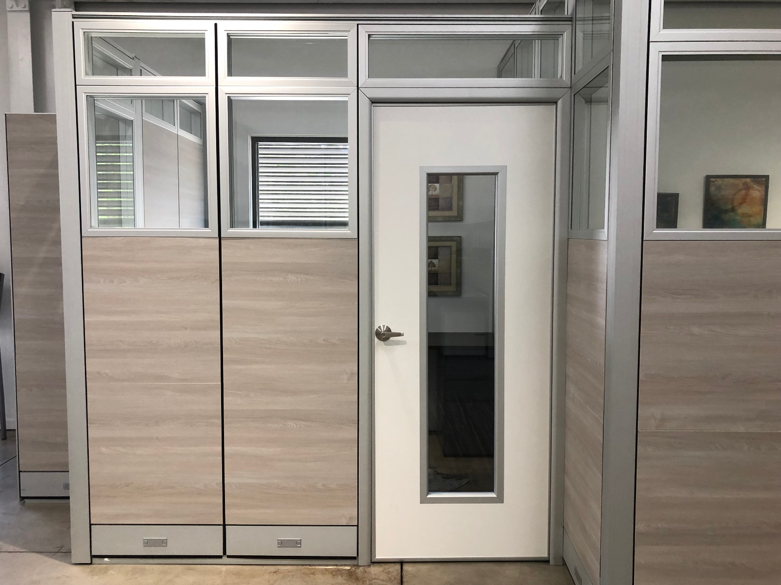 Because of the 84″, 95″, and 108″ tall wall heights, the Sapphire Wall System® is able to incorporate locking doors to our cubicle offices. You can choose between two different swing doors (with or without a glass panel) or a sliding acrylic sliding door with a floor-mounted lock.